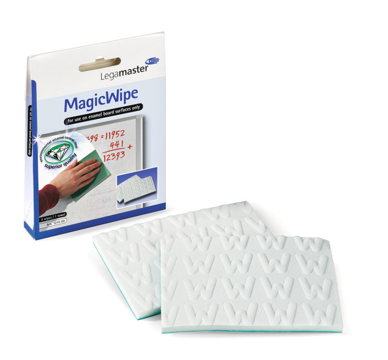 Mikrofiberklut Magic Wipe til whiteboard, 4 pk. Dyprengjøring av tavler, tar også bort de vanskeligste flekker av permanent marker. Fukt med vann, og den er klar til bruk. Kan brukes flere ganger. Leveres med 4 stk. Magic Wipe kluter 13 x 10 cm og 2 kluter for avtørking. Magic Wipe er produsert i mikrofiber, og kan vaskes på 60 grader. Klutene kan slite på overflater som ikke er emaljerte, og bør derfor kun brukes på emaljerte whiteboards.