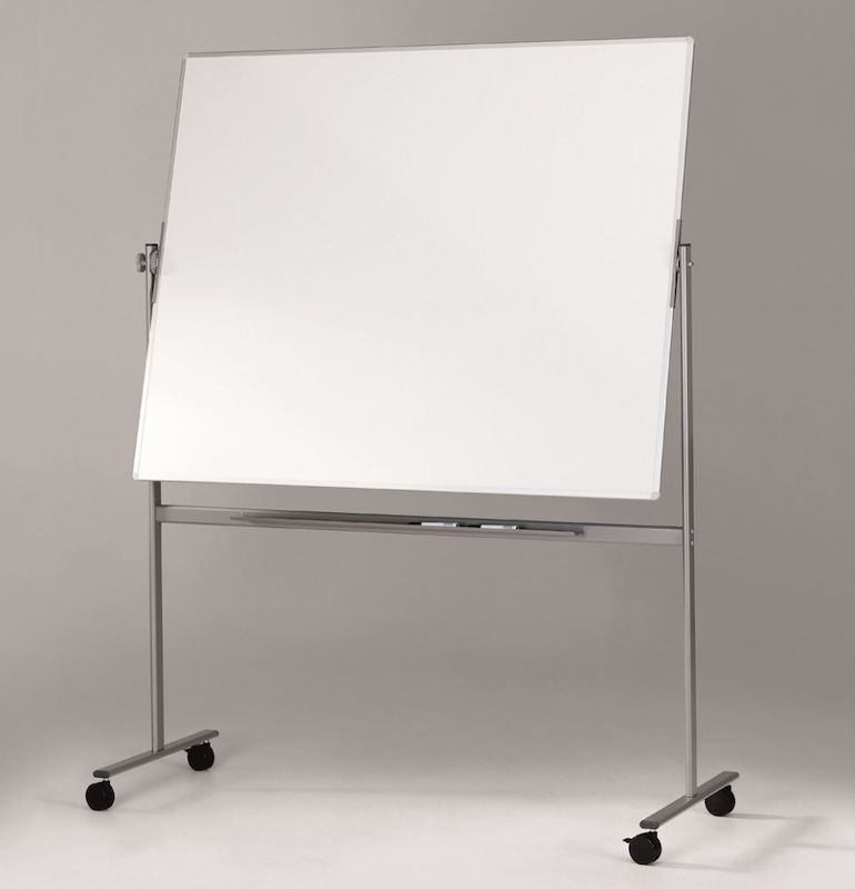 Glassemaljert, vendbar dobbeltsidig whiteboardtavle med magnetfunksjon og pennehylle. Hjulstativ med fire svingbare hjul, hvorav to med brems.