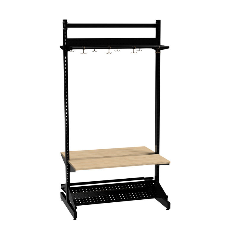 Modell D: Vinklingsbar skohylle og garderobehylle i perforert stål, sittebenk i bjørk.