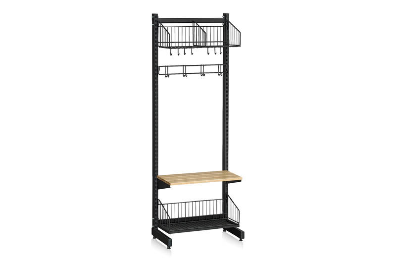 Modell D: Vinklingsbar skohylle og garderobehylle i perforert stål, sittebenk i bjørk.