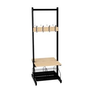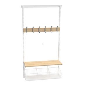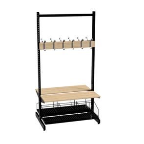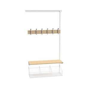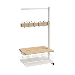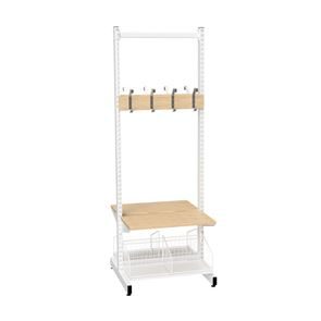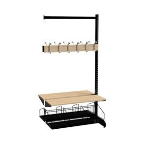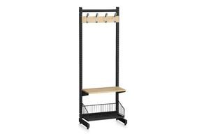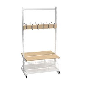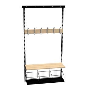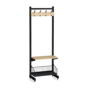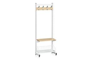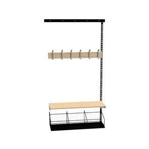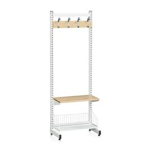 Modell D: Vinklingsbar skohylle og garderobehylle i perforert stål, sittebenk i bjørk.