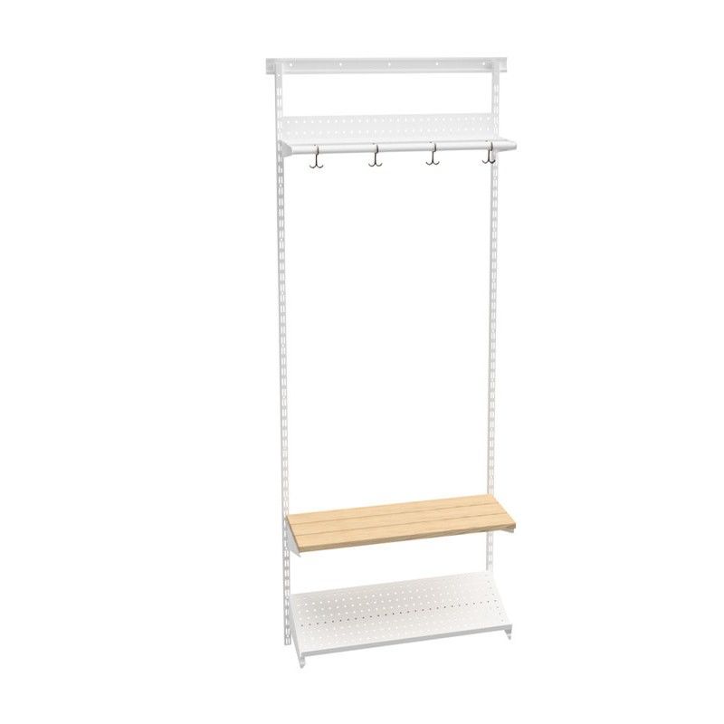 Modell D: Vinklingsbar skohylle og garderobehylle i perforert stål, sittebenk i bjørk.