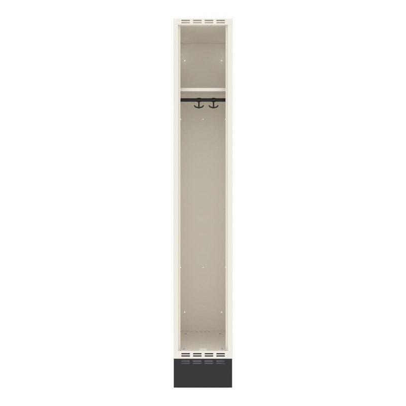 Garderobeskap Sonesson, 1 skap med sokkel, B 300 mm, rød dør og hvit stamme. Robust klesskap i pulverlakkert, helsveiset stål. 15 mm tykke isolerte dører innfelt i karmen, skjulte hengsler og forsterket låshull. Dørstopp ved 90 grader. Ventilasjonsslisser over og under døren gir god ventilasjon. Leveres som standard med skrått tak, flatt tak på forespørsel. Bunnen er perforert og rustbeskyttet. Leveres med hattehylle, klesstang, ankerkroker og håndklekrok. Hvit eller svart stamme, flere farger på dører. Velg mellom sokkel, ben eller benkstativ. Klinke for hengelås er standard. For annet låsalternativ, eller andre farger på skap - kontakt kundeservice på tlf. 67805620.