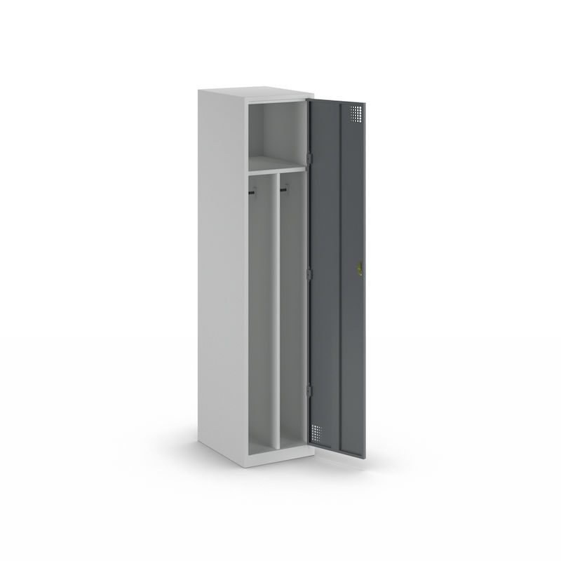 Garderobeskap, 2 delt Alvina, 1 seksjon, lysegrå / basaltgrå, bredde 400 mm, roterende låsebolt. Dette garderobeskapet med todelt rom for rent og skittent tøy i Alvina-serien er et førsteklasses valg for dine oppbevaringsbehov, med et utmerket pris-/ytelsesforhold og en perfekt kombinasjon av funksjonalitet, stabilitet og moderne design.