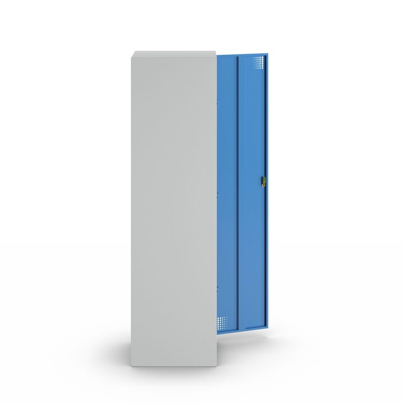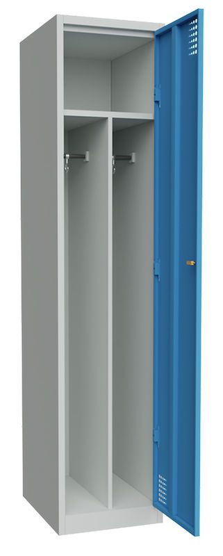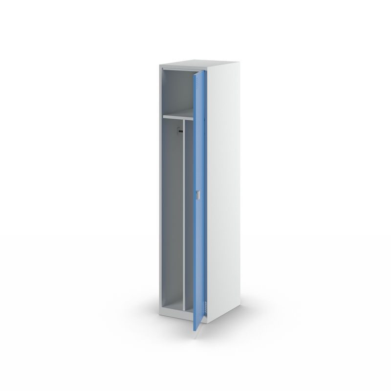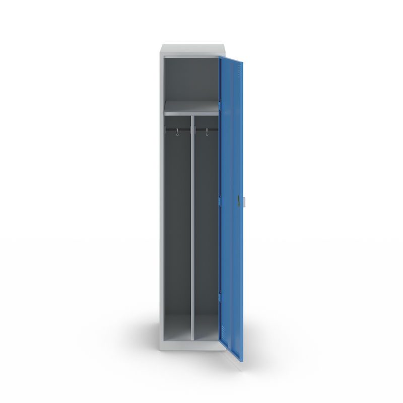Garderobeskap, 2 delt Alvina, 1 seksjon, lysegrå / lyseblå, bredde 400 mm, roterende låsebolt. Dette garderobeskapet med todelt rom for rent og skittent tøy i Alvina-serien er et førsteklasses valg for dine oppbevaringsbehov, med et utmerket pris-/ytelsesforhold og en perfekt kombinasjon av funksjonalitet, stabilitet og moderne design.