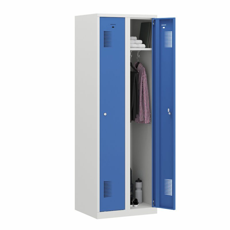 Garderobeskapet er tilgjengelig i forskjellige bredder og med forskjellig antall rom. Dørene med innvendige hengsler er tilgjengelige i forskjellige farger, noe som muliggjør individuell utforming. Valget mellom en sylinderlås eller en innretning for hengelås (bøyle tykkelse 6 – 8 mm) gir ekstra fleksibilitet og sikkerhet. Dørene er utstyrt med etikettfester (30 x 50 mm), etiketter er ikke inkludert i leveransen.