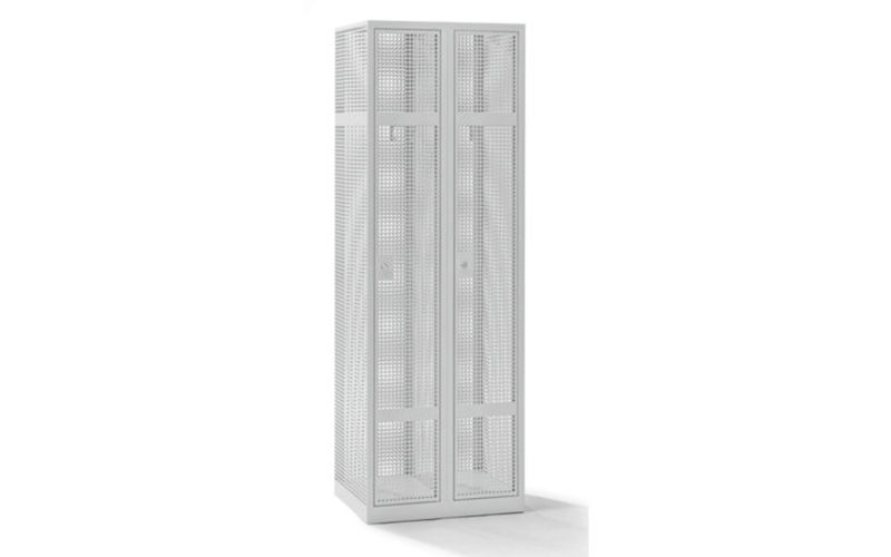 Garderobeskap Klynne, BxDxH 600x500x1800 mm, sylinderlås, 2 dører i 2 skap, grå/grå. Et klesskap med perforert dør og vegger. Optimal ventilasjon for arbeidsklær, sportsklær og sportsutstyr. Leveres ferdig montert med en 60 mm integrert sokkel. Skap med hel dør leveres med hattehylle, klesstang og kroker. Skap med halv dør leveres med klesstang og kroker. Finnes i 2 skapbredder, 300 mm og 400 mm. Stammen er pulverlakkert i grå RAL 7035, og dørene i blå RAL 5012, grå RAL 7035 eller basaltgrå RAL 7012. Skapet er låsbart med roterende sikkerhetsklinke for hengelås eller sylinderlås med 2 nøkler. Hovednøkkel kan kjøpes som tilbehør.