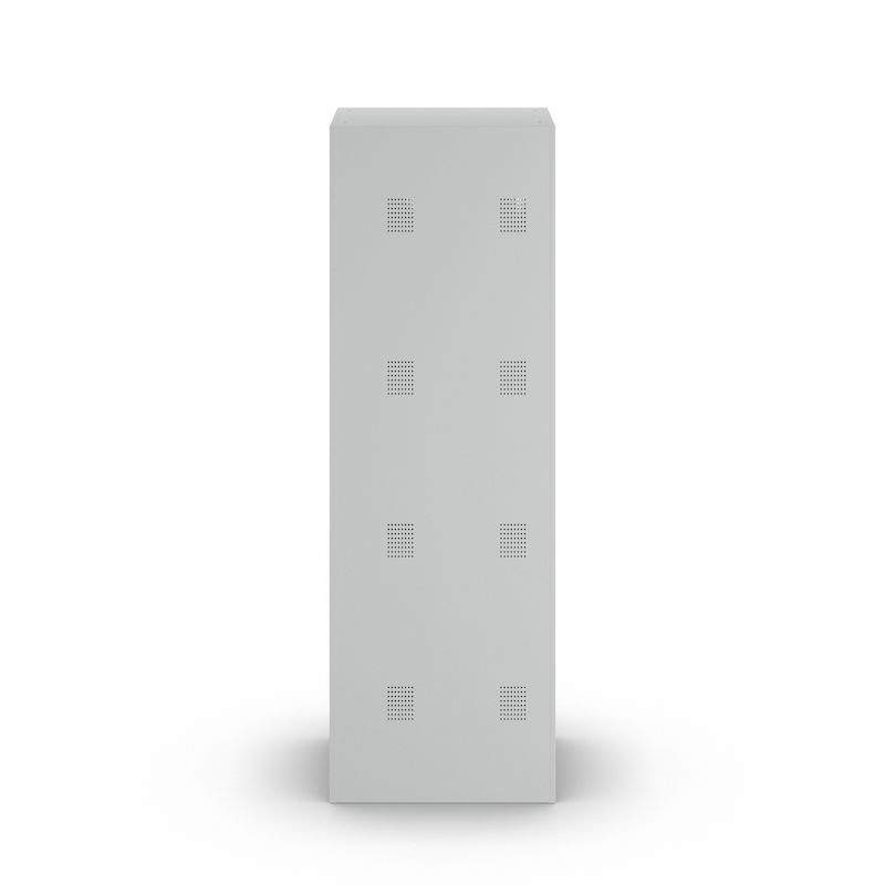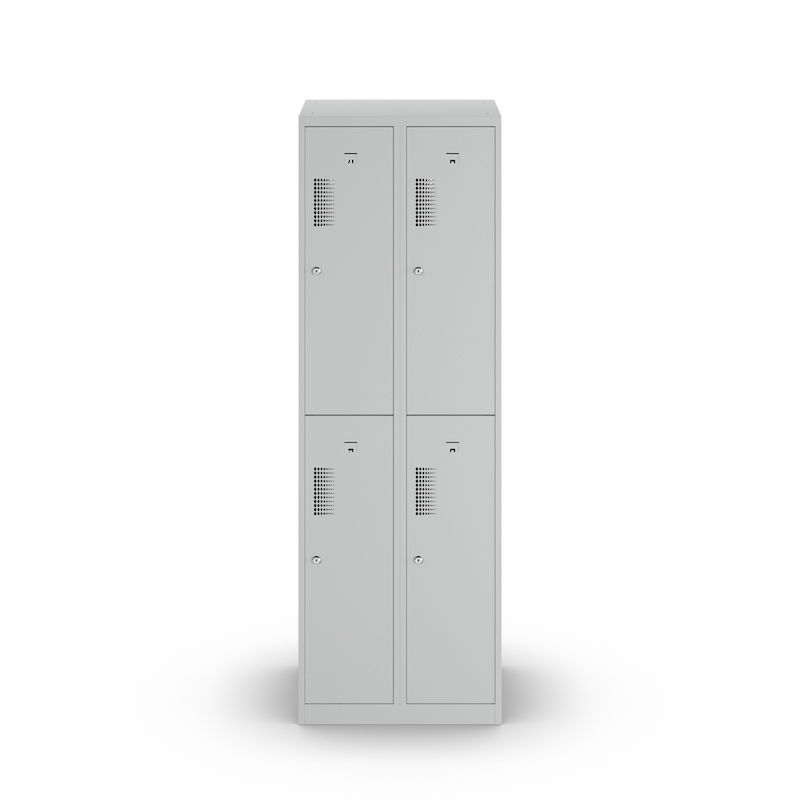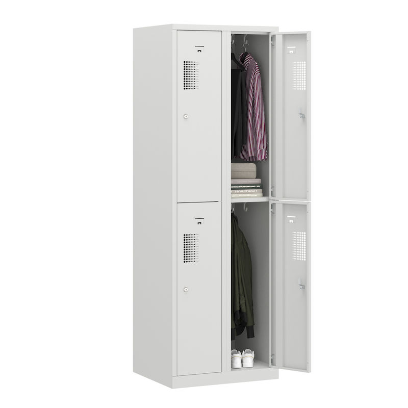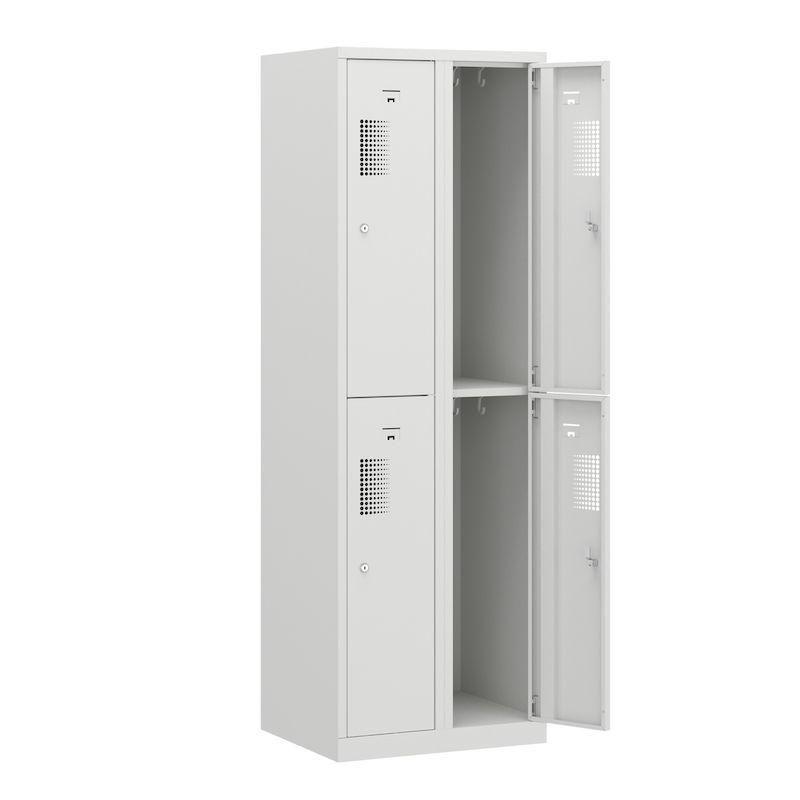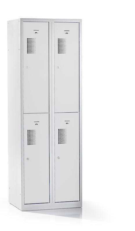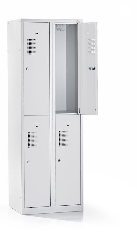 Skapet har en robust konstruksjon i pulverlakkert stål, som gjør det spesielt motstandsdyktig mot riper og korrosjon. Den toetasjes oppstillingen av hyllene gjør det mulig å utnytte plassen på en plassbesparende måte, og er ideell for garderober i verksteder, idrettsklubber eller lager. Takket være det integrerte hullmønsteret sikres optimal luftsirkulasjon.