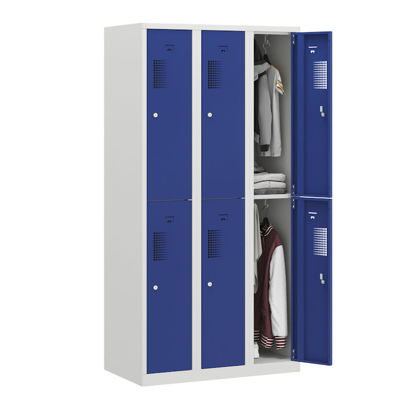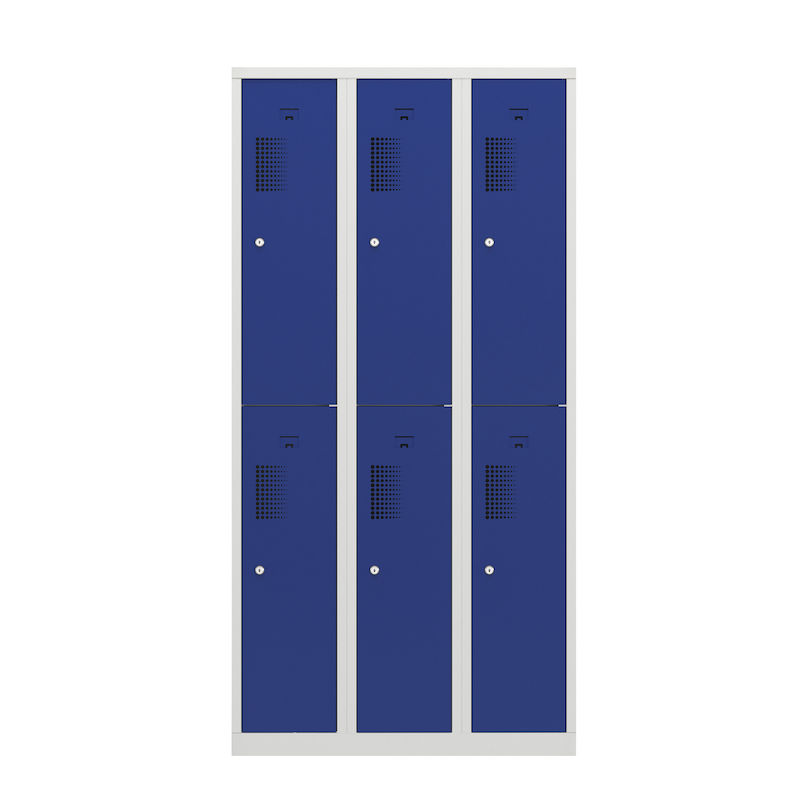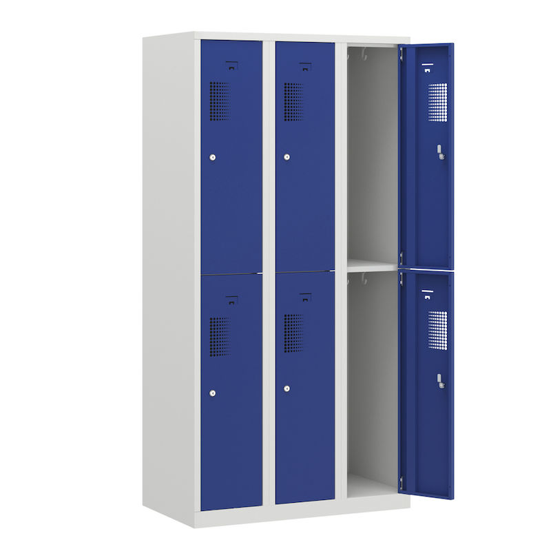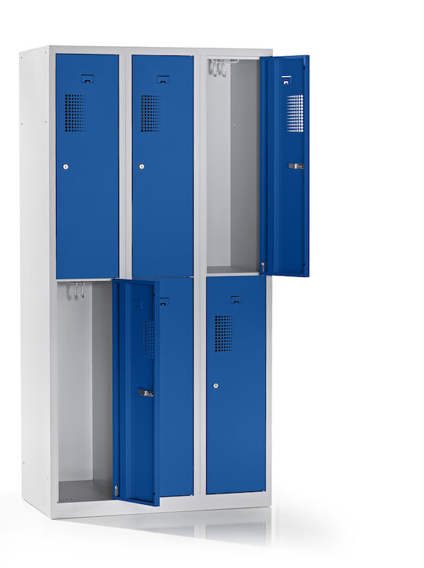 Skapet har en robust konstruksjon i pulverlakkert stål, som gjør det spesielt motstandsdyktig mot riper og korrosjon. Den toetasjes oppstillingen av hyllene gjør det mulig å utnytte plassen på en plassbesparende måte, og er ideell for garderober i verksteder, idrettsklubber eller lager. Takket være det integrerte hullmønsteret sikres optimal luftsirkulasjon.