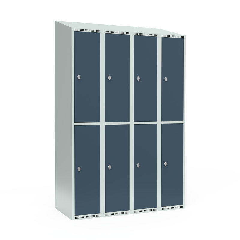 Klesskap Fydor SMG, BxDxH 1200x550x1900 mm, 8 dører i 4 skap, skråtak, grå/lysegrå. Med Fydor-serien får du et klassisk men moderne helsveiset klesskap med høy kvalitet og sikkerhet.