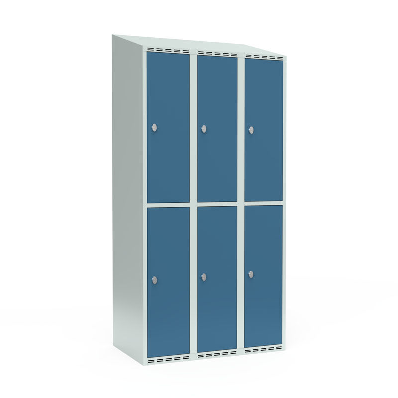 Klesskap Fydor SMG, BxDxH 900x550x1900 mm, 6 dører i 3 skap, skråtak, blå/lysegrå. Med Fydor-serien får du et klassisk men moderne helsveiset klesskap med høy kvalitet og sikkerhet.