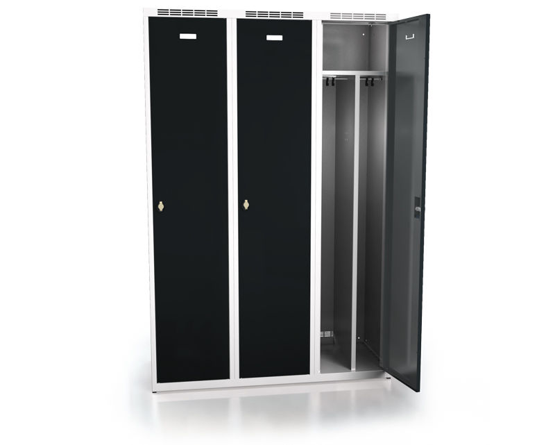 Klesskap Hove, bredde 1200 mm, 3 skap, 3 dører, grå stamme og svart dør. Ferdig montert klesskap med rask levering. 40 mm integrert sokkel. Skap med hel dør leveres med hattehylle, klesstang og kroker. Finnes i 2 rombredder, 300 mm og 400 mm. Høyde 1800 mm, dybde 500 mm. Skap med bredde 400 mm med hel dør leveres med avdelere i skapet for å f.eks skille rene og skitne klær. Stammen er pulverlakkert i RAL 7035 grå, dørene i RAL 5005 blå eller RAL 9005 svart. Kan også leveres med ekstra høy sokkel, benstativ eller benkstativ. Underdelene leveres i et separat kolli for å minske risikoen for transportskader. Skapet er låsbart med klinke for hengelås.