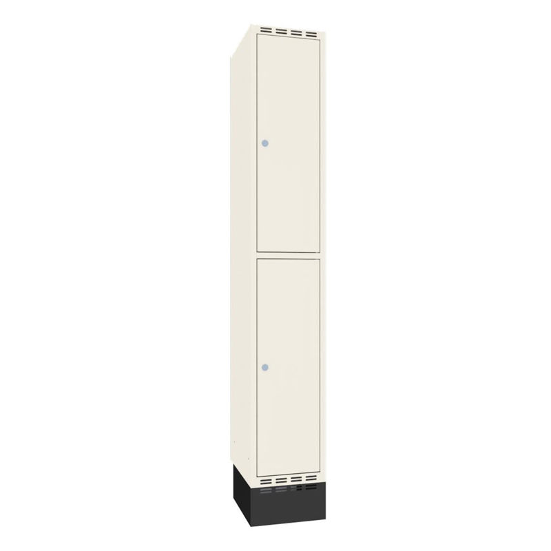 Oppbevaringsskap Sonesson Flex, 1 skap, 2 dører, B 300 x D 400 mm, hvit dør og hvit stamme. Pulverlakkert, helsveiset stål. 15 mm tykke isolerte dører innfelt i karmen, skjulte hengsler og forsterket låshull. Dørstopp ved 90 grader. Helskap leveres med hattehylle, klesstang og ankerkroker. 2-delt skap leveres med klesstang og ankerkroker. Skap med 3 eller 4 rom i høyden leveres uten innredning. Svart sokkel, hvit eller svart stamme, flere farger på dører. Leveres som standard med ASSA-lås 8450. For annet låsalternativ, eller andre farger på skap - kontakt kundeservice på tlf. 67805620.