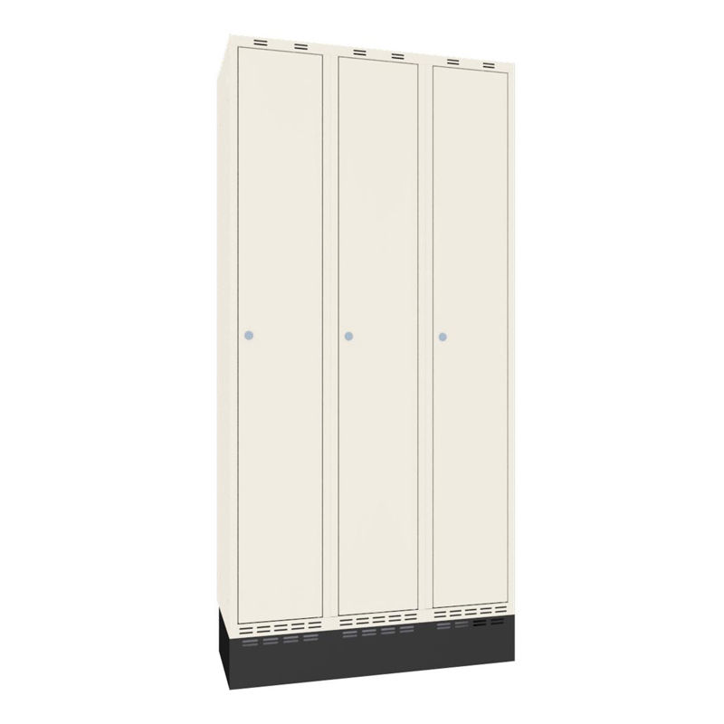 Oppbevaringsskap Sonesson Flex, 3 skap, 3 dører, B 900 x D 400 mm, hvit dør og hvit stamme. Pulverlakkert, helsveiset stål. 15 mm tykke isolerte dører innfelt i karmen, skjulte hengsler og forsterket låshull. Dørstopp ved 90 grader. Helskap leveres med hattehylle, klesstang og ankerkroker. 2-delt skap leveres med klesstang og ankerkroker. Skap med 3 eller 4 rom i høyden leveres uten innredning. Svart sokkel, hvit eller svart stamme, flere farger på dører. Leveres som standard med ASSA-lås 8450. For annet låsalternativ, eller andre farger på skap - kontakt kundeservice på tlf. 67805620.