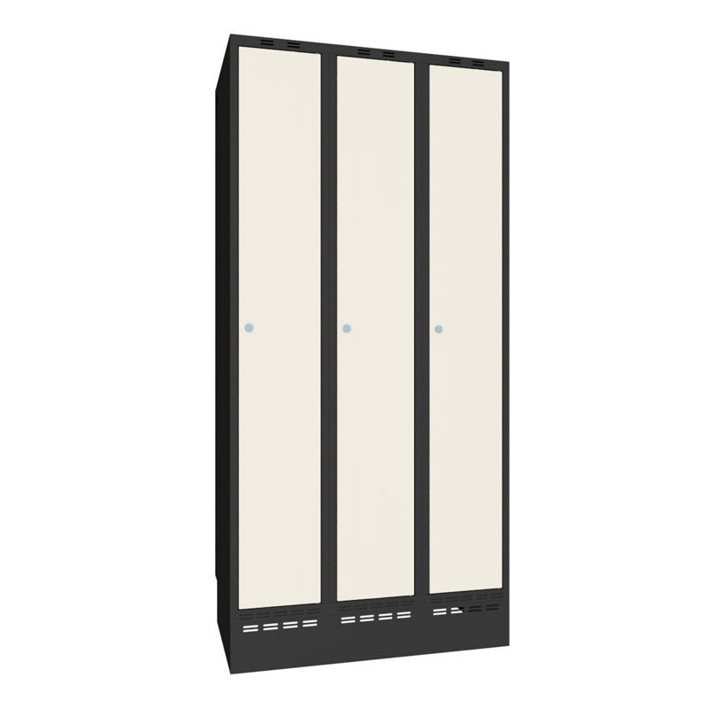 Oppbevaringsskap Sonesson Flex, 3 skap, 3 dører, B 900 x D 550 mm, hvit dør og svart stamme. Pulverlakkert, helsveiset stål. 15 mm tykke isolerte dører innfelt i karmen, skjulte hengsler og forsterket låshull. Dørstopp ved 90 grader. Helskap leveres med hattehylle, klesstang og ankerkroker. 2-delt skap leveres med klesstang og ankerkroker. Skap med 3 eller 4 rom i høyden leveres uten innredning. Svart sokkel, hvit eller svart stamme, flere farger på dører. Leveres som standard med ASSA-lås 8450. For annet låsalternativ, eller andre farger på skap - kontakt kundeservice på tlf. 67805620.