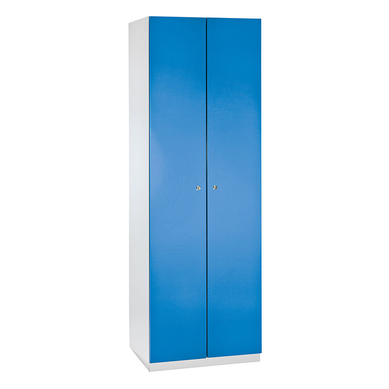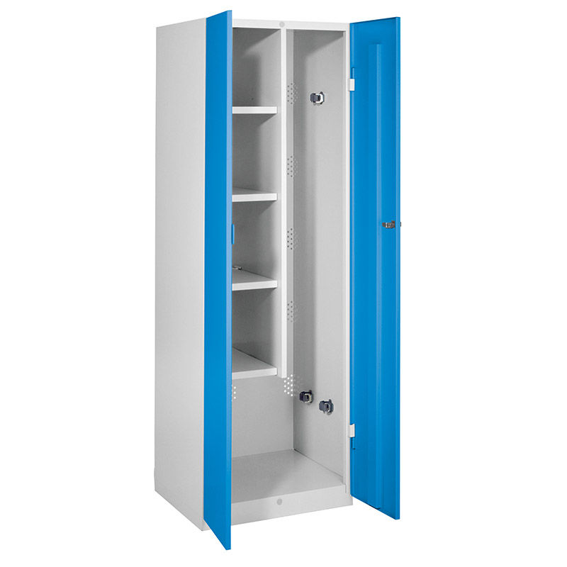 Stålskap med 4 faste hyller og 1 utstyrsseksjon, lyseblå dører og lysegrå stamme. Skap med mange bruksområder. Stabil, sveiset stålkonstruksjon, brennlakkert. Lett rengjøring pga. kantløse innvendige rom. Glatte, enkle og forsterkede dører uten perforering, innvendige hengsler. Stille dører med gummibeskyttelse. Ventilasjon i bakveggen. Innredet med hattehylle, klesstang med tre flyttbare kroker. Sikkerhetssylinderlås med 2 nøkler (individuell låsing).