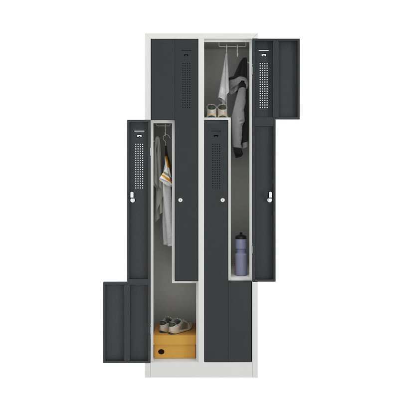 Et Z-skap kombinerer plassbesparende design med gjennomtenkt funksjonalitet. Denne stålgarderobeskapet er perfekt for garderober i bedrifter og fritidsanlegg, og har to garderoberom på arealet til ett enkelt skap. Den intelligente Z-formede romoppsettet sørger for effektiv oppbevaring av klær uten å gå på kompromiss med brukervennligheten.