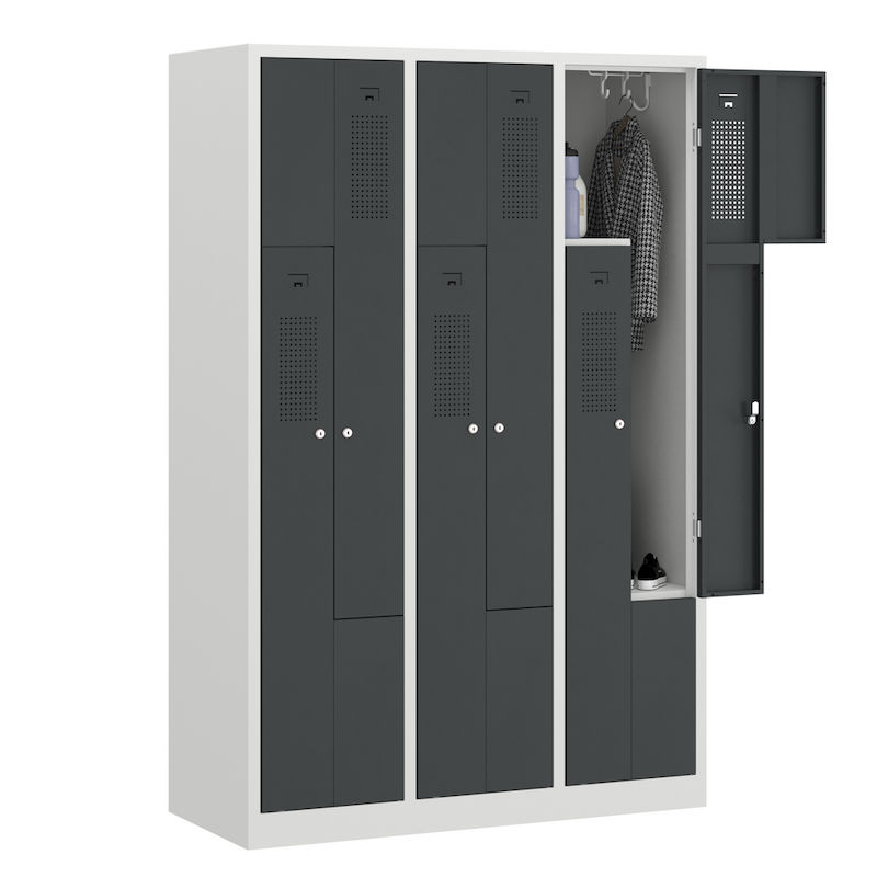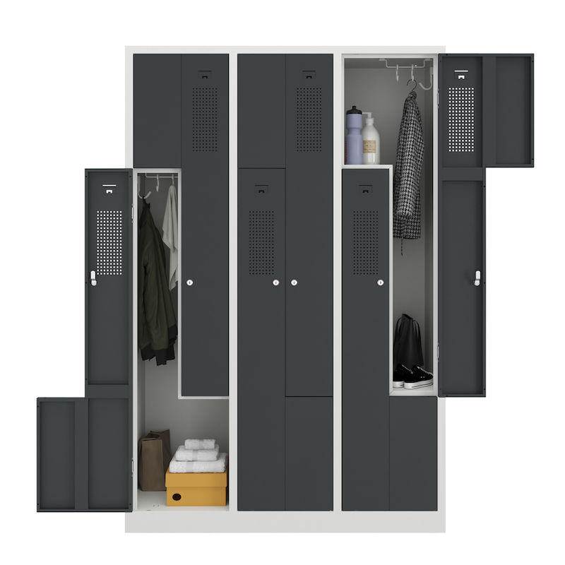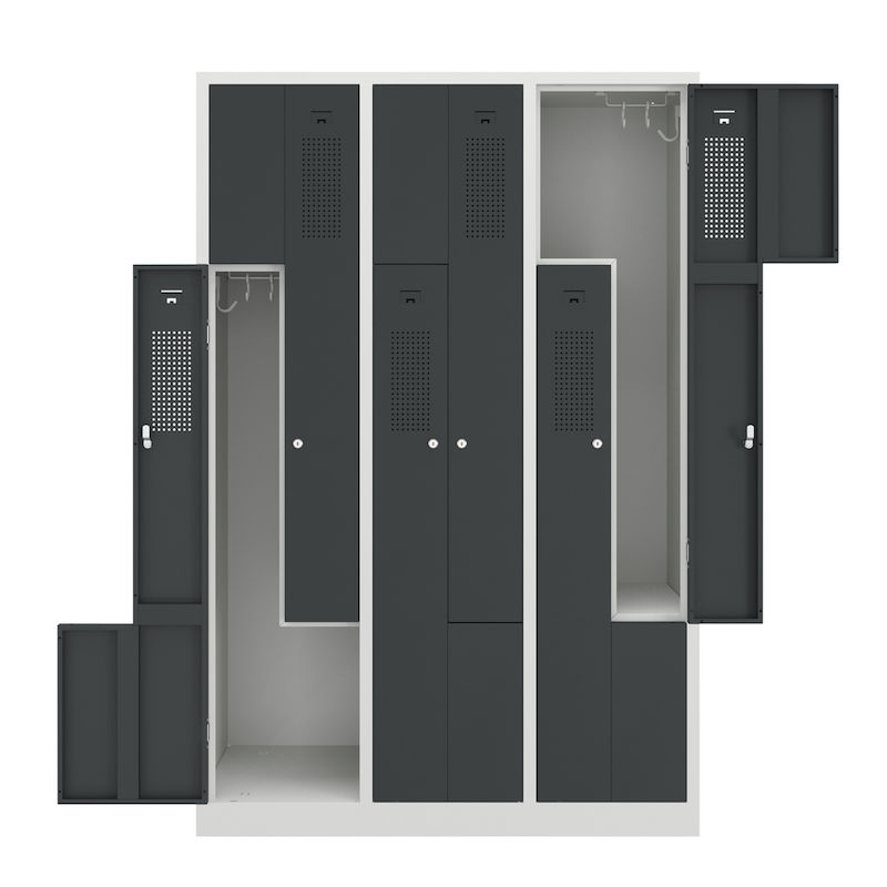 Et Z-skap kombinerer plassbesparende design med gjennomtenkt funksjonalitet. Denne stålgarderobeskapet er perfekt for garderober i bedrifter og fritidsanlegg, og har to garderoberom på arealet til ett enkelt skap. Den intelligente Z-formede romoppsettet sørger for effektiv oppbevaring av klær uten å gå på kompromiss med brukervennligheten.
