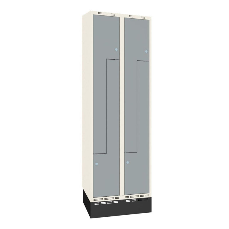 Z-skap Sonesson, 2 skap med sokkel, 4 dører, B 600 mm, grå dør og hvit stamme. Robust klesskap i pulverlakkert, helsveiset stål. 15 mm tykke isolerte dører innfelt i karmen, skjulte hengsler og forsterket låshull. Dørstopp ved 90 grader. To klesskap i ett, praktisk når du har begrenset plass. Z-skapet har god hengehøyde samtidig som det er plass i bredden til sko og utstyr. Skapet har ventilasjonsslisser over og under døren, samt i Z-skilleveggen. Leveres som standard med skrått tak, flatt tak på forespørsel. Bunnen er perforert og rustbeskyttet. Hvit eller svart stamme, flere farger på dører. Velg mellom sokkel, ben eller benkstativ. Klinke for hengelås er standard. For annet låsalternativ, eller andre farger på skap - kontakt kundeservice på tlf. 67805620.