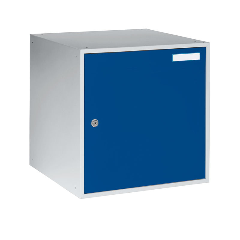 Oppbevaringsskap Kyro HxBxD 450 x 450 x 450 mm, stamme lysegrå, dører mørkeblå. Låsbare småromsskap med mulighet for å kombinere beskyttelse av personlige ting med individuell stil. Utbyggbare etter behov, småromsskapene kan kobles på hverandre fra alle sider. Av pulverlakkert stål. Leveres med sylinderlås, 2 nøkler. Som tilbehør finnes benstativ som passer til 3 rom i bredden.