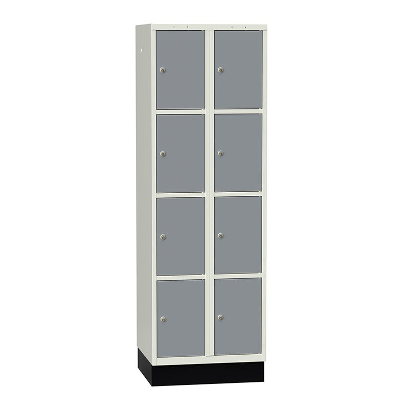 Personalskap Sonesson Flex, 2 skap, 8 dører, B 600 x D 550 mm, grå dør og hvit stamme. Pulverlakkert, helsveiset stål. 15 mm tykke isolerte dører innfelt i karmen, skjulte hengsler og forsterket låshull. Dørstopp ved 90 grader. Helskap leveres med hattehylle, klesstang og ankerkroker. 2-delt skap leveres med klesstang og ankerkroker. Skap med 3 eller 4 rom i høyden leveres uten innredning. Svart sokkel, hvit eller svart stamme, flere farger på dører. Leveres som standard med ASSA-lås 8450. For annet låsalternativ, eller andre farger på skap - kontakt kundeservice på tlf. 67805620.