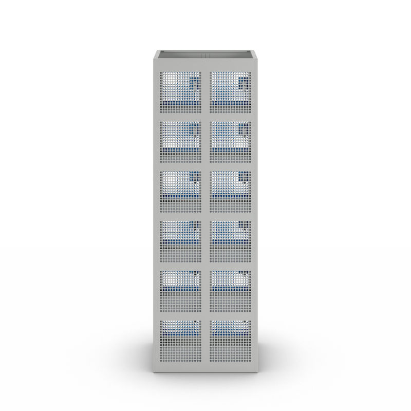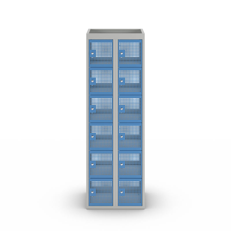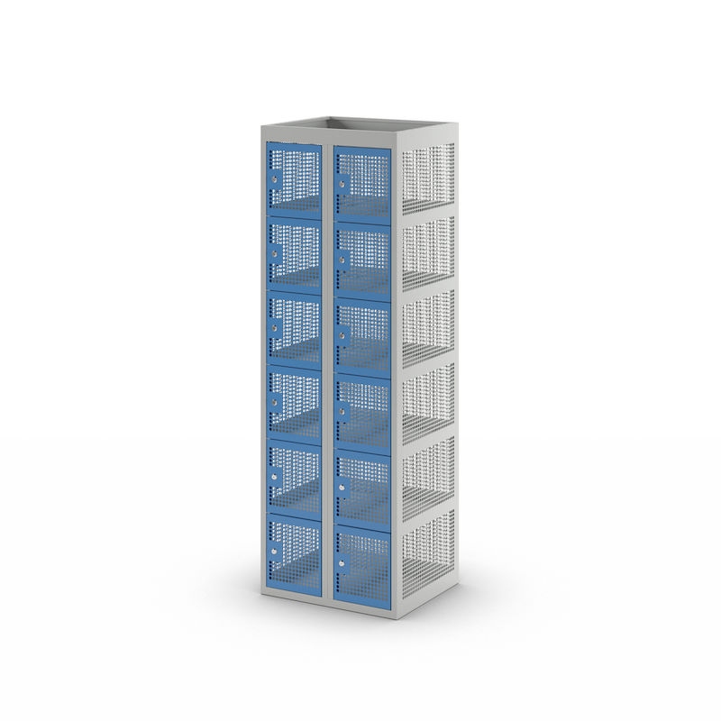 Småromsskap Klynne, BxDxH 600x500x1800 mm, sylinderlås, 12 dører i 2 skap, grå/blå. Et oppbevaringsskap med perforerte dører og vegger. Optimal ventilasjon for arbeidsklær, sportsklær og sportsutstyr. Leveres ferdig montert med en 60 mm integrert sokkel.