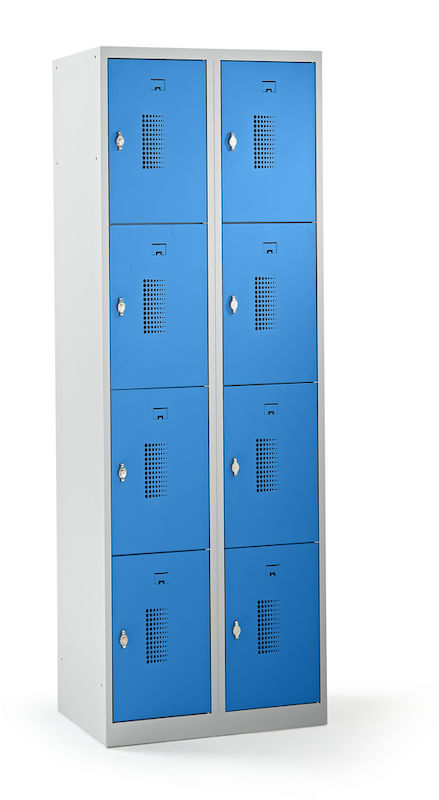 Småromsskap med 4 rom Amsterdam, 2 seksjoner, lysegrå / lyseblå, B 600 mm,8 rom, roterende låsebolt. Vårt prisgunstige skap med låsbare rom overbeviser med funksjonalitet, holdbarhet og mange bruksmuligheter. Skapets stamme er lysegrå og lett å rengjøre. Pulverlakkert stål med en materialtykkelse på 0,70 mm garanterer den nødvendige sikkerheten ved oppbevaring av personlige verdisaker. Du kan variere antall skap, låsetype, dørfarge og skapbredde etter behov og individuell plass. Hullene i dørene til metallskapet sørger for optimal luftsirkulasjon.