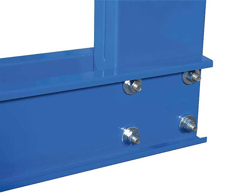 Lakkert i slitesterk pulverlakk med standardfarger: blå søyler og stagseksjoner samt oransje armer.