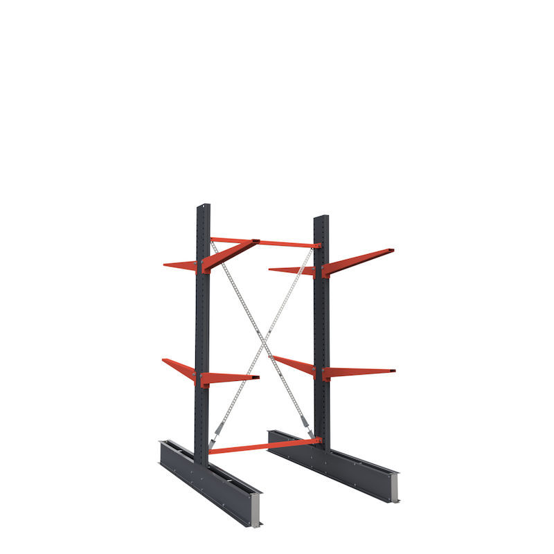 Grenreoler Attillo, dobbeltsidig, HxB 2500 x 2000 mm, arm 1000 mm, grunnseksjon. Komplett reol med stolper, føtter, armer, lengde- og tverrforbindelser og betongskruer for forankring til gulvet.