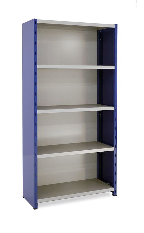 Lagerhylle Gerdmanshyllen, blå/grå, heldekkende gavler og rygg, grunnseksjon, BxDxH 1000x400x1960. Belastning per hylleplate 150 kg, som enkelt kan oppgraderes til 225 kg og 1200 kg per seksjon. Enkel montering, hylleplatene monteres enkelt med hyllehaker uten verktøy eller skruer. Kan innredes med skuffer, avdelere, verktøypaneler, dører m.m. Hyllen må forankres i vegg eller gulv. Gulvbeskyttelse følger med. Fleksibelt hyllesystem. Du setter sammen hyllen med utgangspunkt i eget oppbevaringsbehov og lokalets utseende.