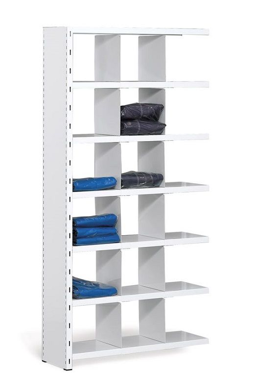 Lagerhylle Gerdmanshyllen, hvit, 18 rom, utbyggingsseksjon, BxDxH 1000x400x1960. 18 rom på 6 innvendige hylleplater med 12 sideinndelinger. Belastning per hylleplate 150 kg, som enkelt kan oppgraderes til 225 kg og 1200 kg per seksjon. Enkel montering, hylleplatene monteres enkelt med hyllehaker uten verktøy eller skruer. Kan innredes med skuffer, avdelere, verktøypaneler, dører m.m. Hyllen må forankres i vegg eller gulv. Gulvbeskyttelse følger med. Fleksibelt hyllesystem. Du setter sammen hyllen med utgangspunkt i eget oppbevaringsbehov og lokalets utseende.
