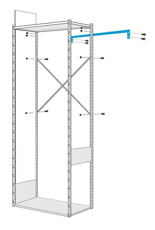 Ryggstag til lagerhylle Gerdmanshyllen, rett, for hyllebredde 930 mm, hvit. Krysstag er vanligst for å oppnå sidestabilitet. I situasjoner der du trenger en gjennomgående hylle og krysset derfor er i veien, kan du bytte det med et rett stag som plasseres på begge sider av hylleseksjonen.
