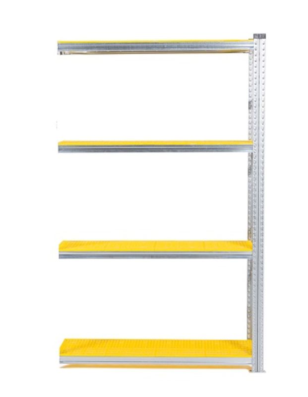 Lagerhylle Flex, H 1972 mm utbyggingsseksjon, BxD 1206x320 mm, 4 stk gule plasthyller. Et fleksibelt hyllesystem av galvanisert stål med mange bruksområder. Lav egenvekt – høy belastning, 135-350 kg/hylleplater. Flyttbare bjelker, 33 mm:s intervall. Hylleplater for ulike arbeidsmiljøer. Enkel å montere (ingen bolter eller skruer). Kan brukes bra begge sider, ingen krysstag. Gavlene leveres montert, bærebjelker og metallføtter inngår i hver seksjon. Alle hyllene er næringsmiddelgodkjente og perforerte tilpasset miljøer med sprinklersystem, vannet renner igennom.