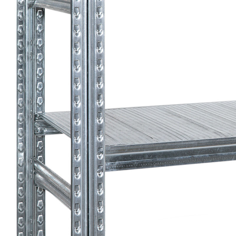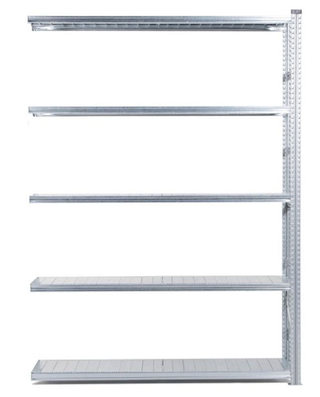 Lagerhylle Flex, H 2500 mm utbygningsseksjon, BxD 1806x320 mm, 5 st galvaniserte hylleplater. Et fleksibelt hyllesystem av galvanisert stål med mange bruksområder. Lav egenvekt – høy belastning, 135-350 kg/hylleplater. Flyttbare bjelker, 33 mm:s intervall. Hylleplater for ulike arbeidsmiljøer. Enkel å montere (ingen bolter eller skruer). Kan brukes bra begge sider, ingen krysstag. Gavlene leveres montert, bærebjelker og metallføtter inngår i hver seksjon.