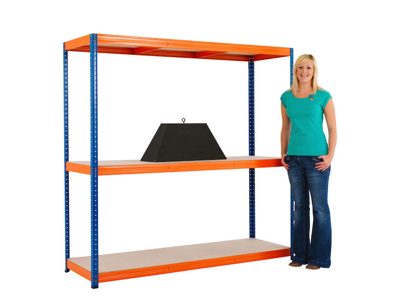 Egnet for store, voluminøse varer. For bruk i lagerrom, verksteder og garasjer. Pulverlakkert stålramme i blått og oransje. Hyller av tett sponplate med stålstøtter i midten.