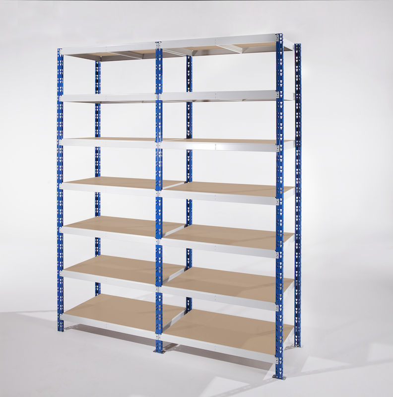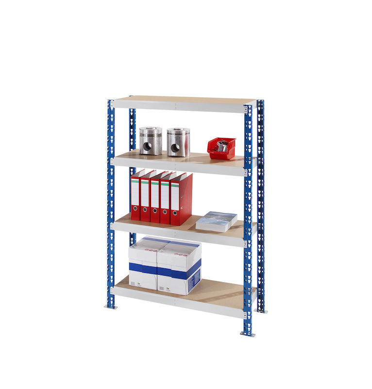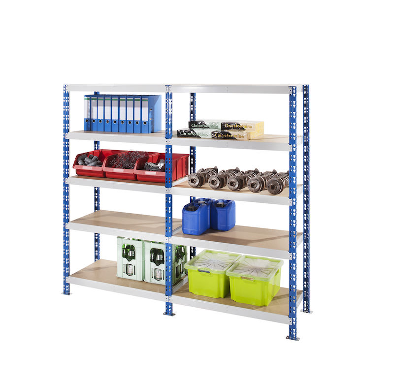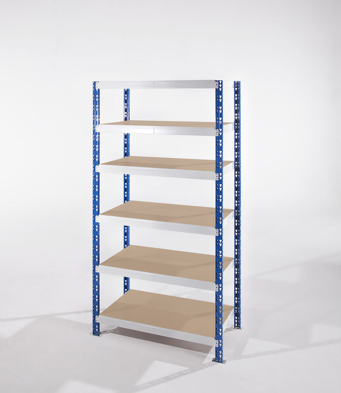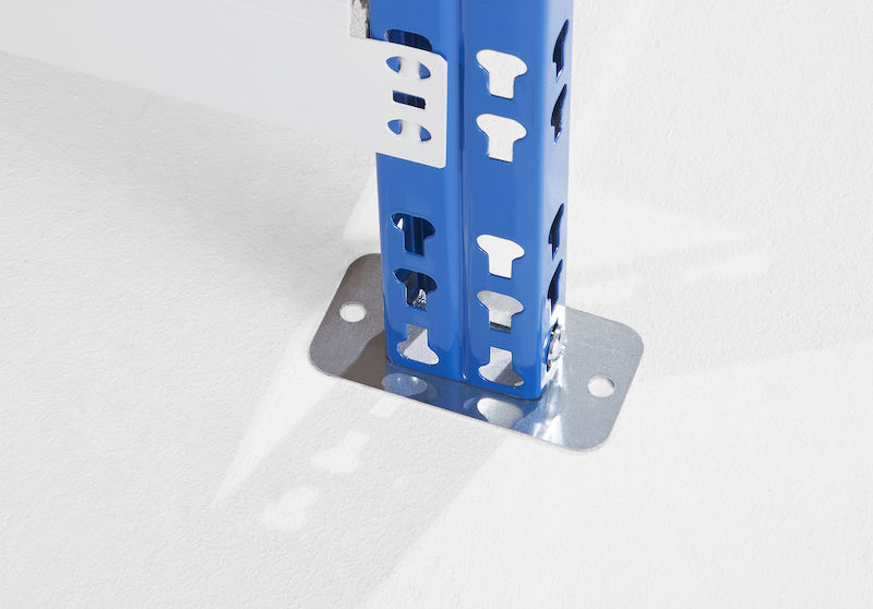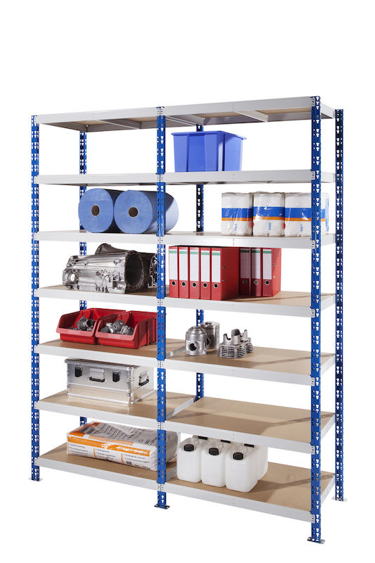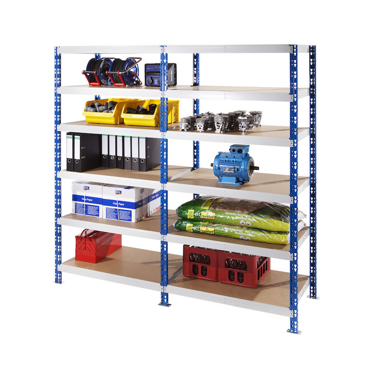 Lagerhyller, universal, stabil Jolene, sponplatehyller, HxBxD 1976 x 1050 x 400 mm, grunnseksjon. Hyllestolpene er utstyrt med galvaniserte bunnplater (98 x 51 mm), som øker de angitte hyllehøydene med 1 mm i hvert tilfelle. Skruer og plugger til fotplatene skaffes av kunden.