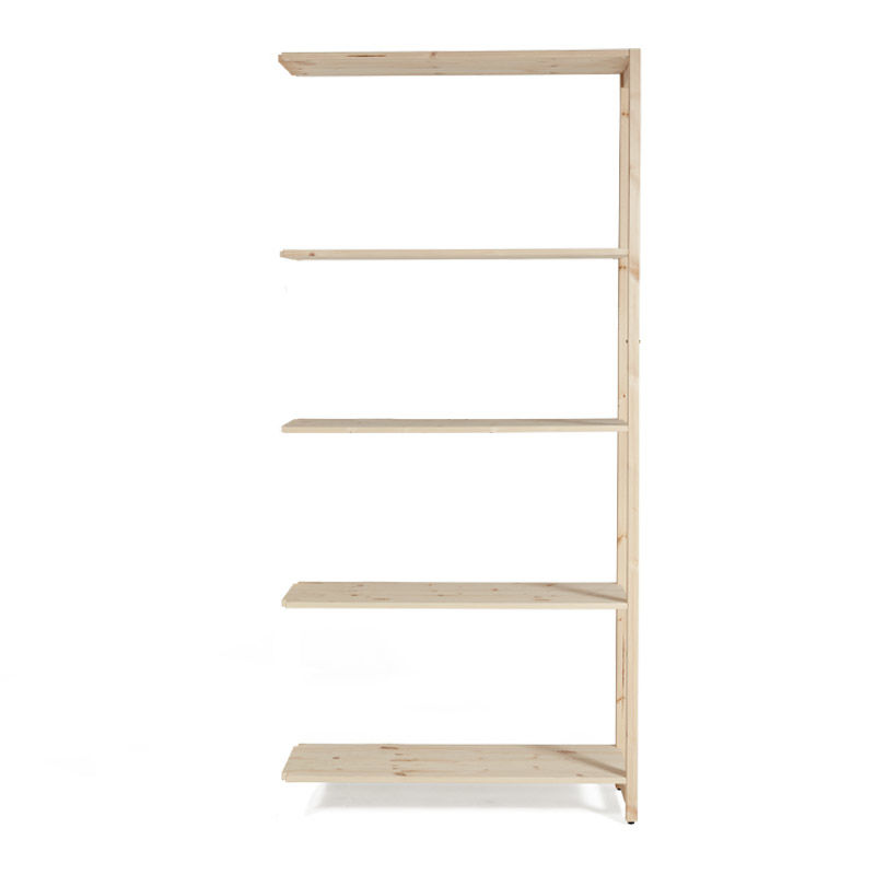 Trehylle Tidan, utbyggingsseksjon, HxBxD 1780x800x600 mm. En trehylle i ubehandlet massiv furu. Produsert fra FSC-sertifisert råvare. Trehyllen finnes som grunnseksjon eller utbyggingsseksjon. Høyde 1780 mm eller 2180 mm, dybde 300-600 mm, bredde 830 eller 1030 mm. Hyllen tåler en fordelt belastning på 90 kg/hylleplate og ca 500 kg/seksjon. Hyllen leveres komplett med 5 hylleplater. Ben med stillskruer. Ryggkryss kjøpes separat.