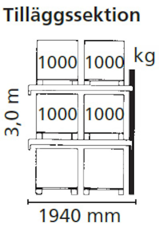 H3000 mm 6 paller, 1000 kg/pall, 9000 kg/seksjon