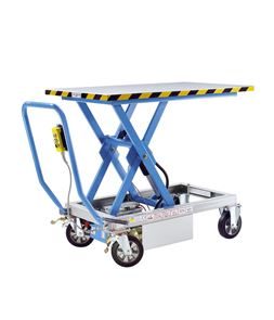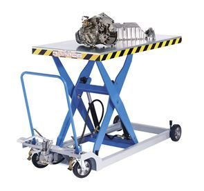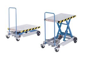 Løftebord med hjul Kira, manuell heving, løfteområde 510 – 1400 mm. Sakseløft med hydraulisk løftesylinder (bioolje) og nedfellbar pedal. Senking ved hjelp av pedal. Skyvebøyle inkludert.