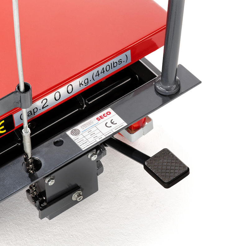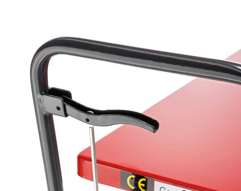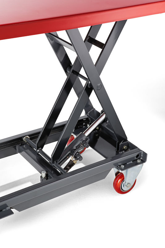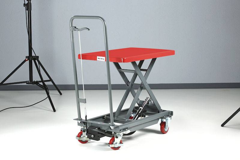 Løftebordvogn Hera, løfteområde 265 – 755 mm, lastekapasitet 200 kg. Løftes med pumpepedal, trinnløs senking med håndtak. Holdbare og velkonstruerte enheter. Servicevennlige, med inspeksjonsstøtter. Pulverlakkert i basaltgrå RAL 7012 og signalrød RAL 3001.