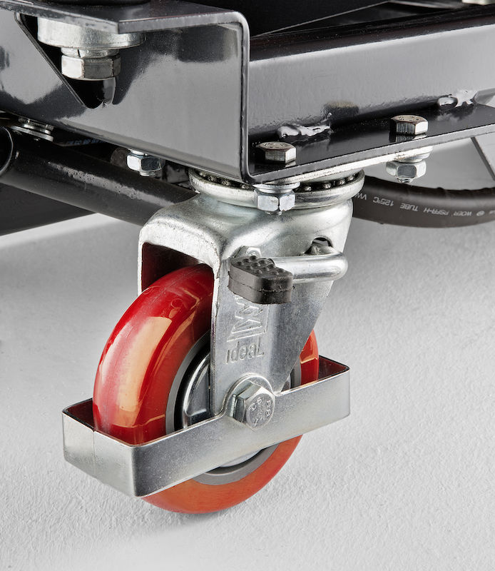 2 svingbare hjul med fotbeskyttelse og brems og 2 faste hjul. Alle hjulene har gulvbeskyttende polyuretanmønster.