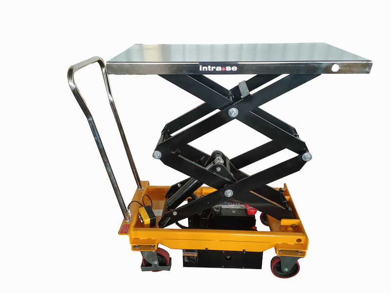Løftebordvogn, LxB 1010x520 mm, elektrisk, løftekapasitet 500 kg. Hydrauliske løftebordvogner heves med fotpumpe og senkes med håndregulering. Elektriske løftebordvogner heves og senkes med håndregulering. Batteri og lader følger med de elektriske. To faste og to svingbare hjul med brems. Fotbeskyttelse av platemetall på de svingbare hjulene. Oppfyller krav i henhold til EN 1570.