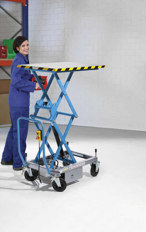 Løftevogn med hjul Kira, elektrohydraulisk motor 12 V, lastekapasitet 500 kg. Rustfri, galvanisert plattform. Pulverlakkert, løftesaks og skyvehåndtak lyseblå RAL 5012, understell i hvit aluminium RAL 9006.