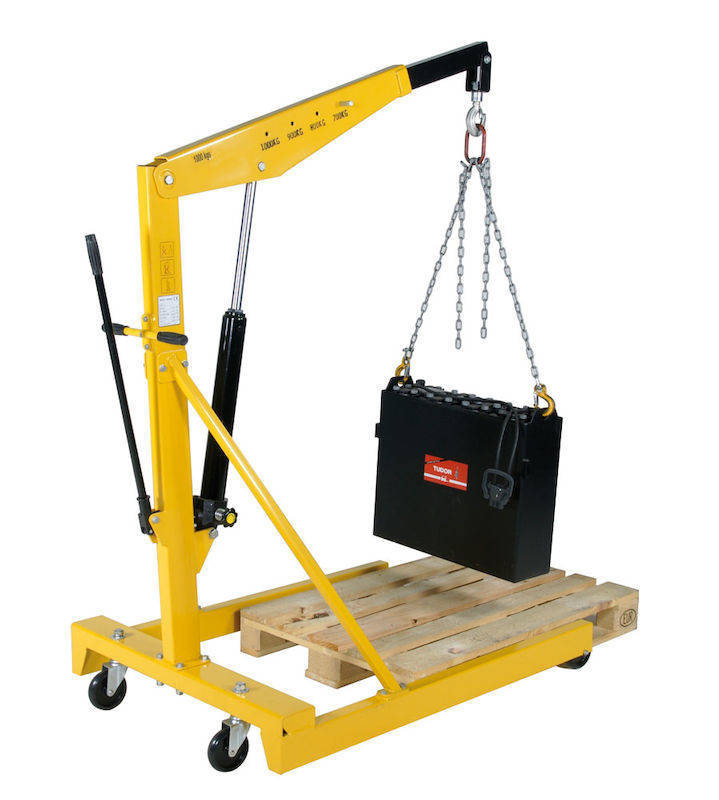 Verkstedkran Hjuke, med pall-understell. Praktisk verkstedkran med 1000 kg lastekapasitet. Helsveiset stativ tilpasset EUR-pall. Utdragbar bom som er innstillbar i fire posisjoner. Rask løft med dobbel sylinder. Sikkerhetsventil mot overbelastning.
