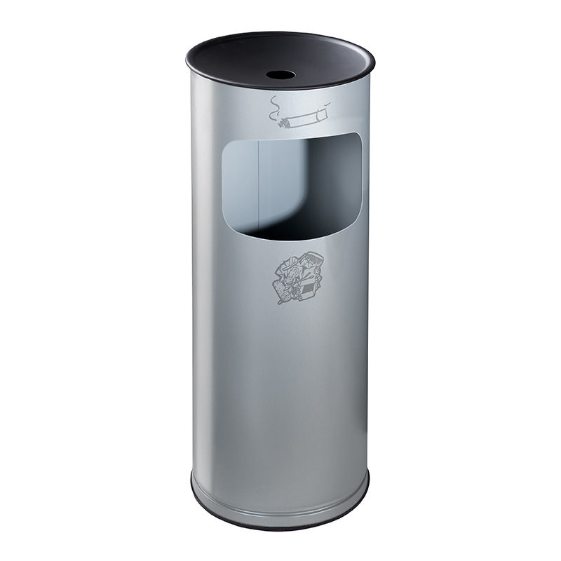 Gulvaskebeger med papirkurv, stål, sølv, høyde 610 mm, avfallsvolum 17 l. Det traktformede lokket sørger for at sigarettavfallet glir ned i beholderen. Gjennom den lille åpningen i lokket er det ingen oksygentilgang, dermed ingen antenning og nærmest ingen lukt. Avtagbart lokk av metall, svartlakkert. Oppsamlingskopp i aluminium for sigarettavfall. Godt dimensjonert åpning for avfallsinnkast. Stamme av galvanisert og pulverlakkert stål med gulvskånende kantbeskyttelse.