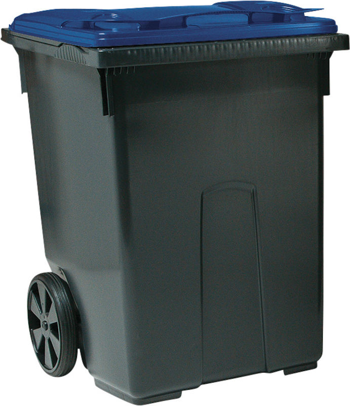 Avfallsbeholder PWS, 370 l, grå/blå. Gode avfallsbeholdere er nødvendig på alle arbeidsplasser. Beholderne har mange bruksområder når det gjelder å ta vare på papir, glass, bokser, metallspon og andre restprodukter. Beholderne er produsert i UV-stabilisert HD-polyeten, og finnes i flere størrelser mellom 80 og 370 liter. Formen, størrelsen og hjulenes plassering er et resultat av nøyaktige ergonomiske studier. Beholderne er både lette å flytte, tømme og holde rene. Alle beholdere er grå, med lokk i forskjellige farger.