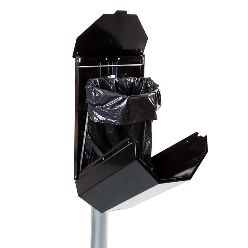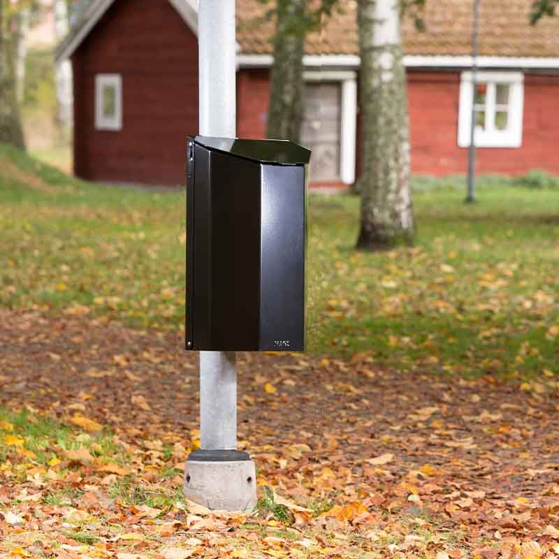 Søppelkassen har skrånende tak og er laget av varmforsinket og pulverlakkert stålmetall.