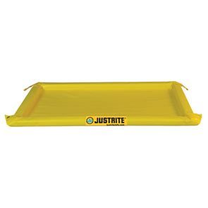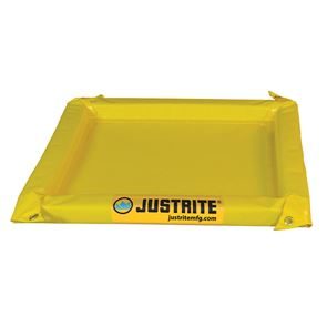 Oppsamlingskar Justrite, sammenleggbart, LxBxH 3552x3152x51 mm, volum 511 liter, umontert. For midlertidig oppbevaring av beholdere, batterier, skitne maskindeler og andre produkter under vedlikehold. Oppsamlingskar for innen- og utendørs bruk. Beskytter og forhindrer at utslipp av kjemikalier og oljer når avløpet. Produsert av meget motstandskraftig og UV-bestandig PVC. Vaskbar med såpevann og gjenbrukbar. Sidevegger med PU-skumkjerne som retter seg opp selv, fleksibel og overkjørbar. Felles enkelt sammen for å spare plass. Sideveggene er 152 mm brede.