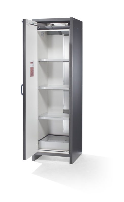 Det robuste karosseriet er laget av flammehemmende, melaminharpiksbelagte spesialpaneler, mens den robuste stålplatedøren har et strukturert pulverbelegg. Døren låses i alle åpningsvinkler, noe som gjør lasting og lossing enklere. En åpen dør er selvlukkende i tilfelle brann. Takket være det integrerte transportunderstellet kan skapet enkelt transporteres og flyttes internt i bedriften. Døren er kompatibel med låsesystemer og kan låses med en profilsylinder. Avluftstilkoblingen i taket (NW 75) gir mulighet for tilkobling til et teknisk avtrekkssystem.