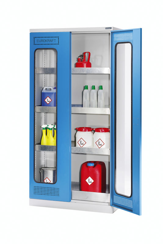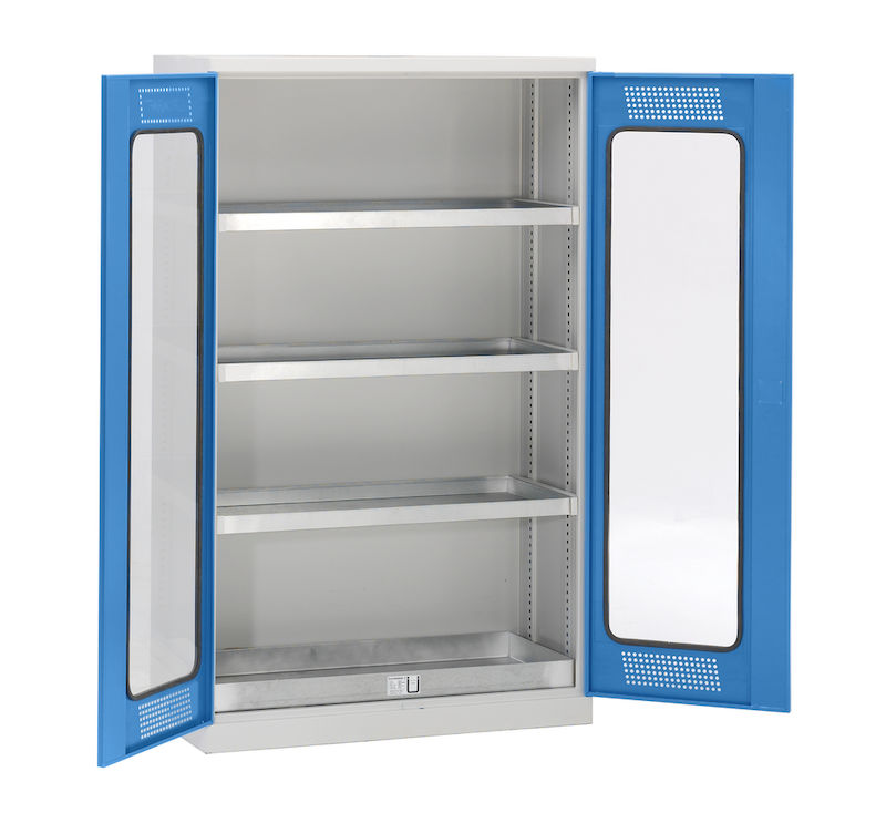 Miljøskap Stig, med glassdører, 3 karhyller, 1 gulvkar, bredde 1200 mm. Vårt eurokraft pro miljøskap muliggjør sikker oppbevaring av kjemiske stoffer. Det robuste metallskapet imponerer med en konstruksjon av høy kvalitet: Skapet er laget av forsterket stålplate, pulverlakkert i lysegrått (korpus) og lyseblått (dører). Skapet kan låses med sylinderlås og tildekket låsekobling, noe som gir maksimal beskyttelse. Miljøskapet eurokraft pro er ideelt for profesjonell oppbevaring av vannforurensende væsker. Med låsbare dører og en effektiv ventilasjonsløsning lagres kjemikalier på en trygg måte.